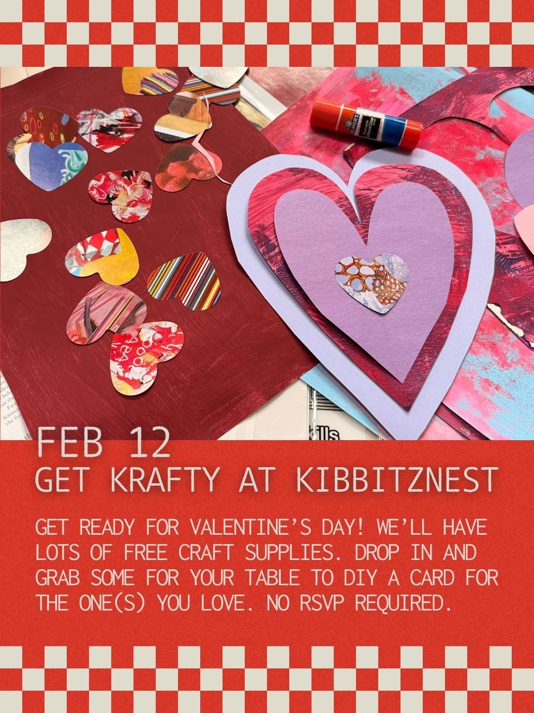 Get Ready for Valentine’s Day! We’ll have lots of free craft supplies. Drop in and grab some for your table to DIY a card for the one(s) you love. No RSVP required!