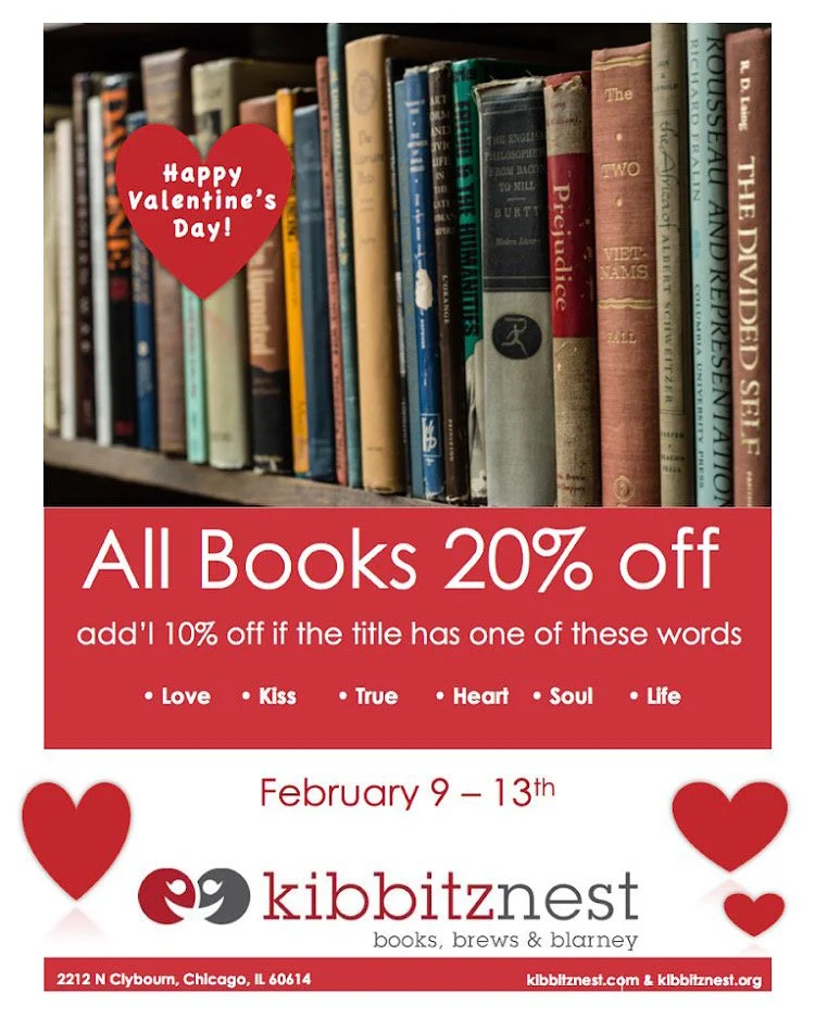 Valentine’s Book Sale Wednesday, February 9, 2022 4:00 PM 16:00 Sunday, February 13, 2022 5:30 PM 17:30 Kibbitznest (map) Google Calendar ICS